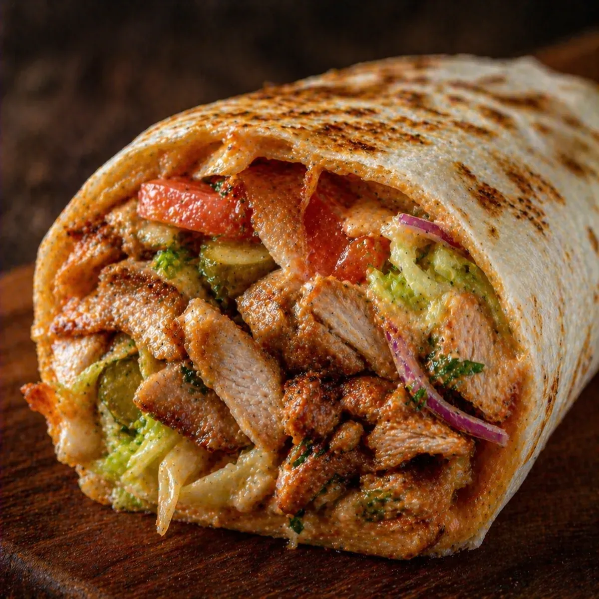 Лаваш, курица гриль, овощи, фирменный соус.